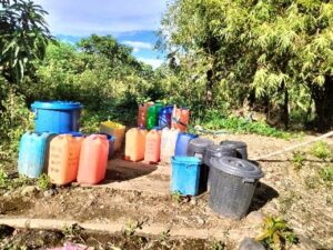 Gallons on pile to fetch water from the deep well with limited water supply.